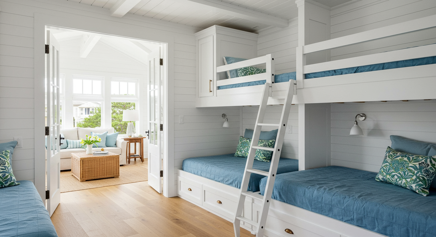 TV Loft with Built-In Bunks: The TV loft is a cozy haven with two twin built-in bunks. It's a perfect space for children, and the young at heart, to enjoy movies and games.