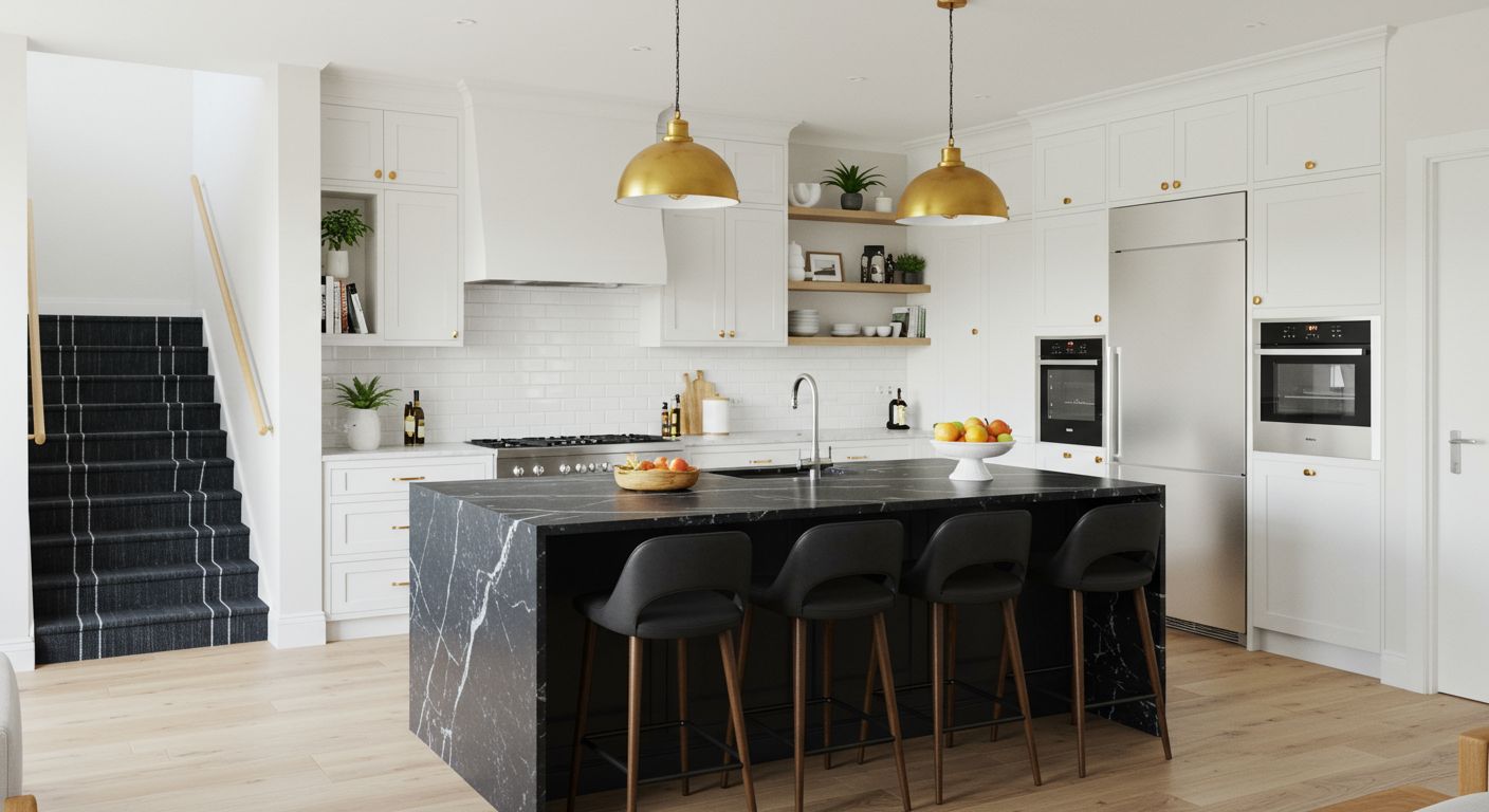 Entertainer's Dream Kitchen: The kitchen is a chef's dream come true. High-gloss white custom cabinetry and a matte black custom island with a 43'' Kohler workstation sink/cutting board are just the beginning. KitchenAid French Door Refrigerator, Dishwasher, and a 5-burner Dual Fuel Thermador Convection Oven/Range offer a top-tier culinary experience.